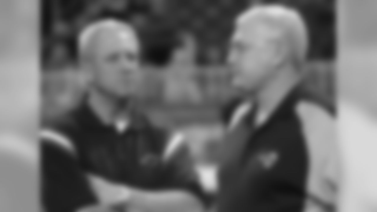 St. Louis Rams head coach Mike Martz, right, talks with Carolina Panthers coach John Fox before the NFC semifinal game Saturday, Jan. 10, 2004 in St. Louis. (AP Photo/Bill Boyce)