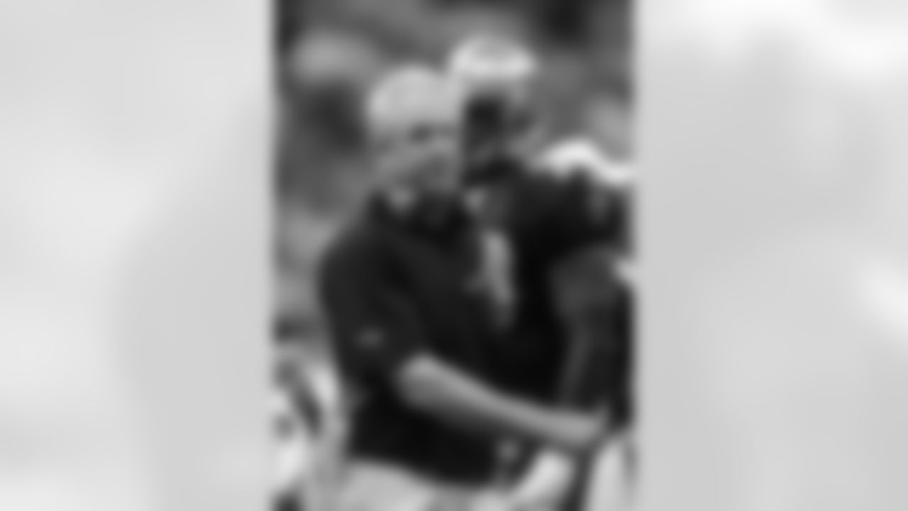 New Orleans Saints coach Sean Payton, left, and Saints defensive end Charles Grant (94) hug at the end of an NFL football game against the Carolina Panthers in New Orleans, Sunday, Nov. 8, 2009.The Saints defeated the Panthers 30-20. (AP Photo/Bill Haber)