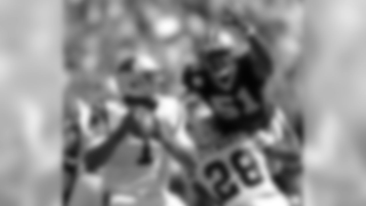 Carolina Panthers' Cam Newton (1) prepares to throw a pass as Jonathan Stewart (28) blocks New Orleans Saints' Jonathan Vilma (51) during the first quarter of an NFL football game in Charlotte, N.C., Sunday, Oct. 9, 2011. (AP Photo/Rick Havner)
